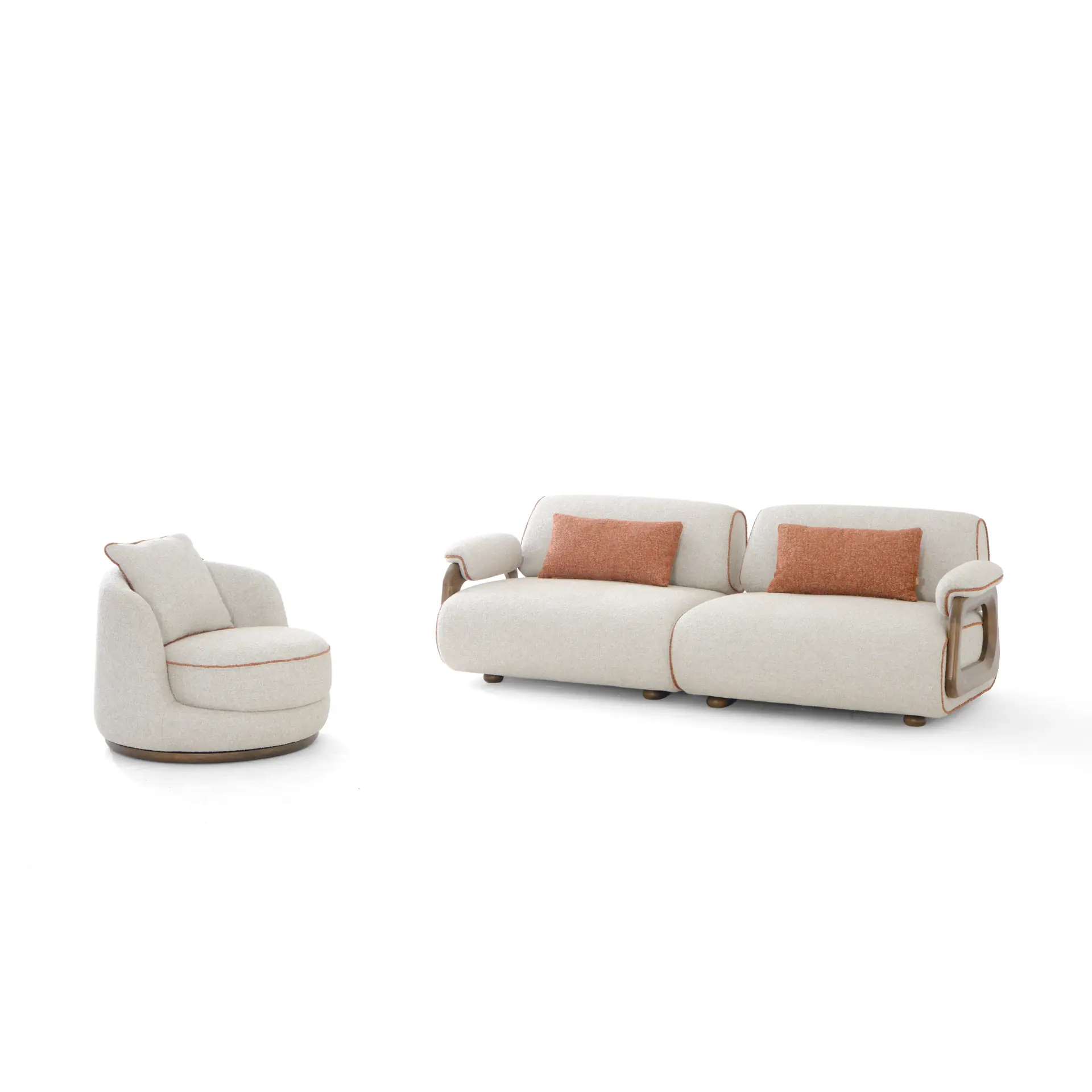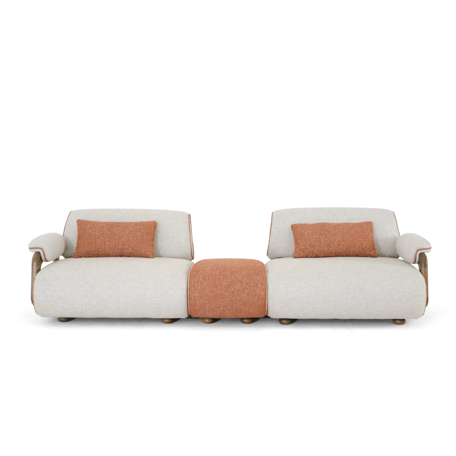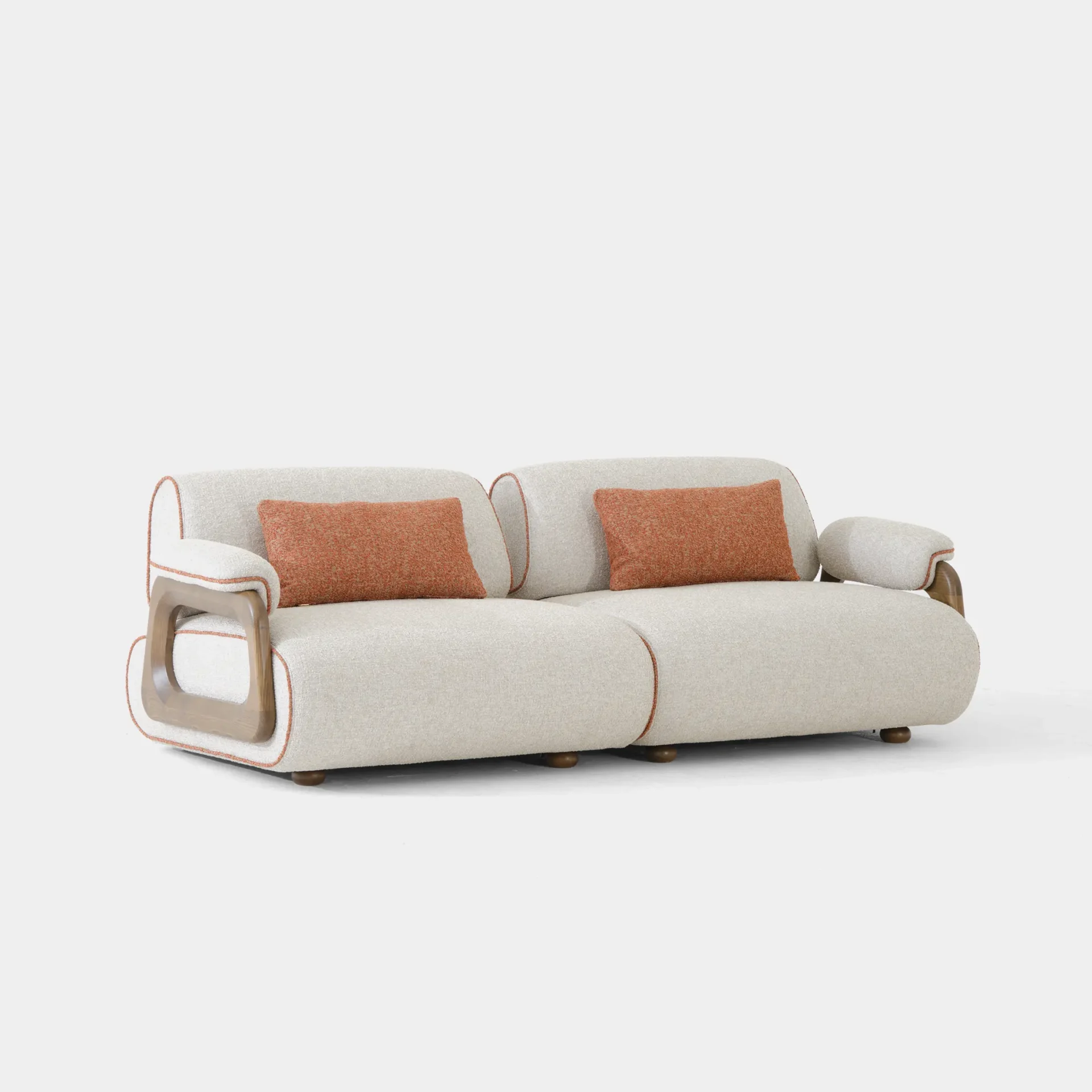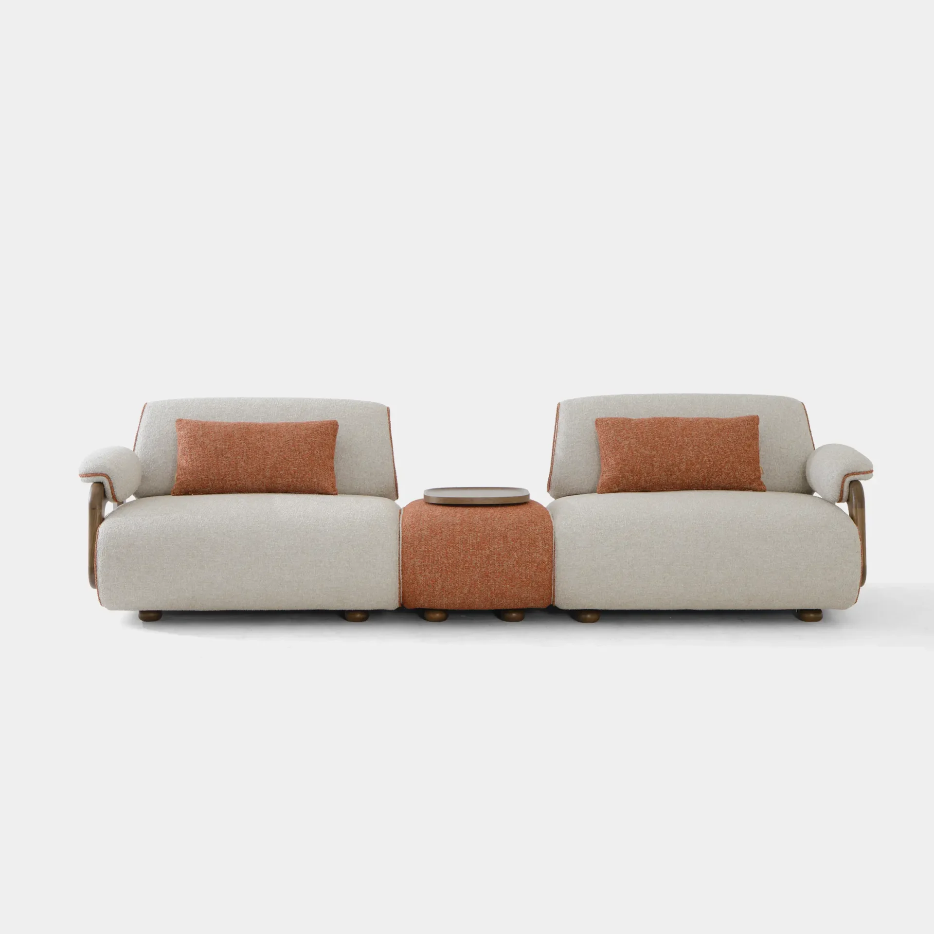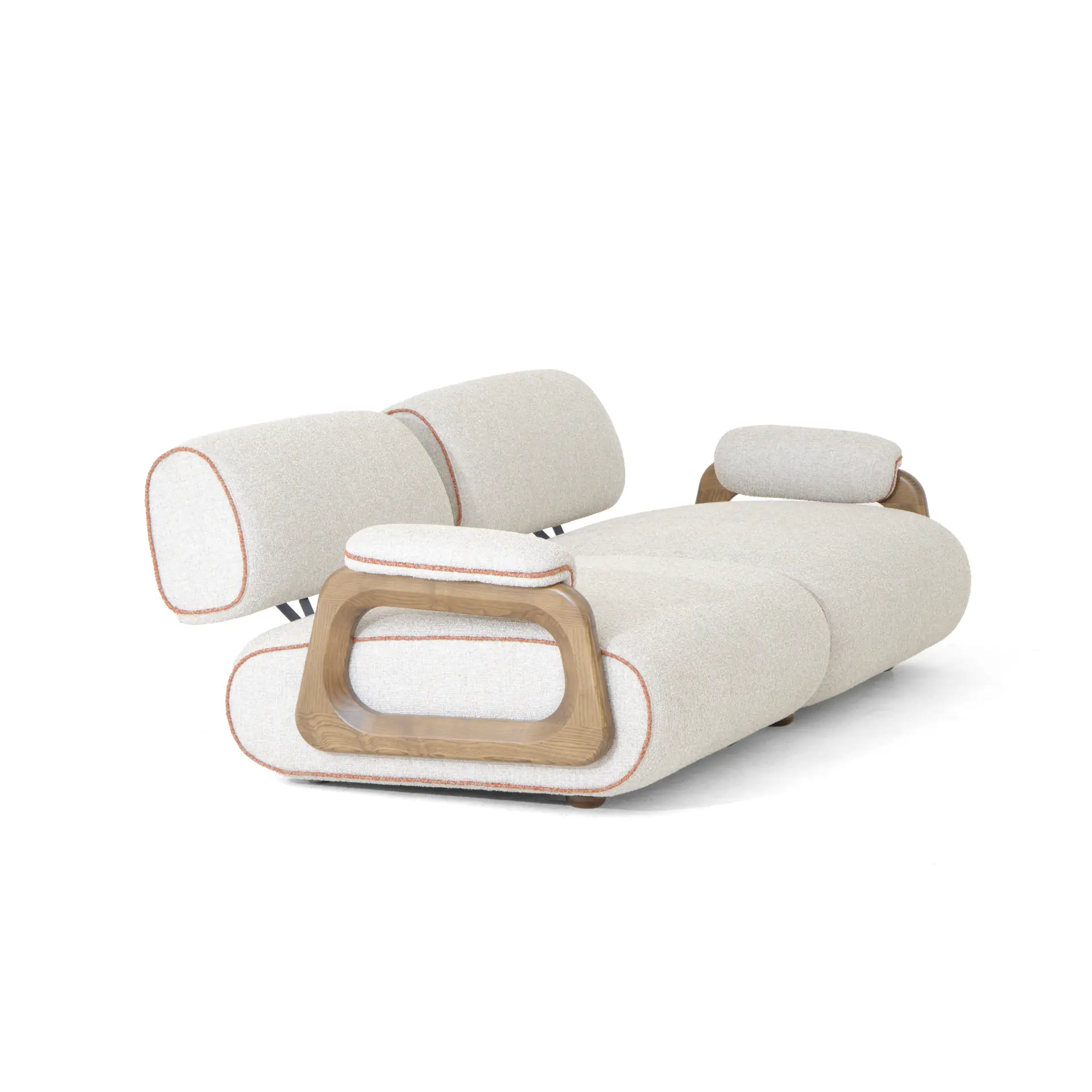 Defined by softly rounded forms and generous proportions, the Biana Modular Sofa feels more sculpted than assembled. Upholstered in a textured woven fabric with subtle contrast piping, each module is grounded by warm solid wood arm details that add architectural balance. The backrest can be manually adjusted to create a more relaxed seating position, allowing Biana to adapt effortlessly to lounging, conversation, or quiet moments of rest.