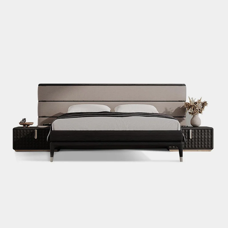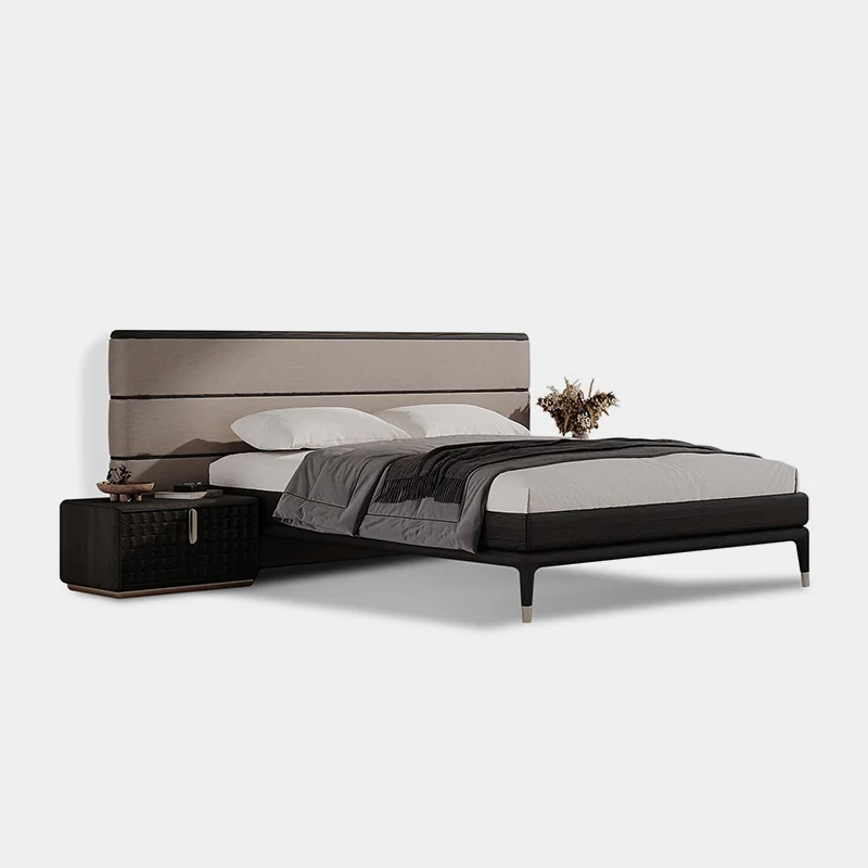 - The Eldora King Bed features a striking extended headboard with soft fabric panels, creating both visual depth and a sense of refined comfort.