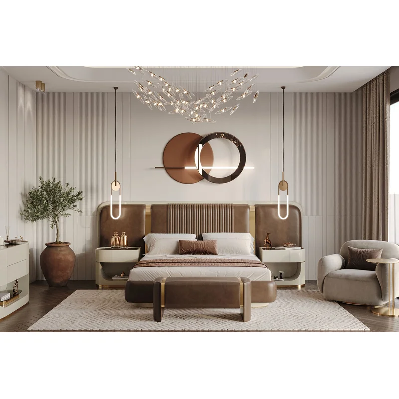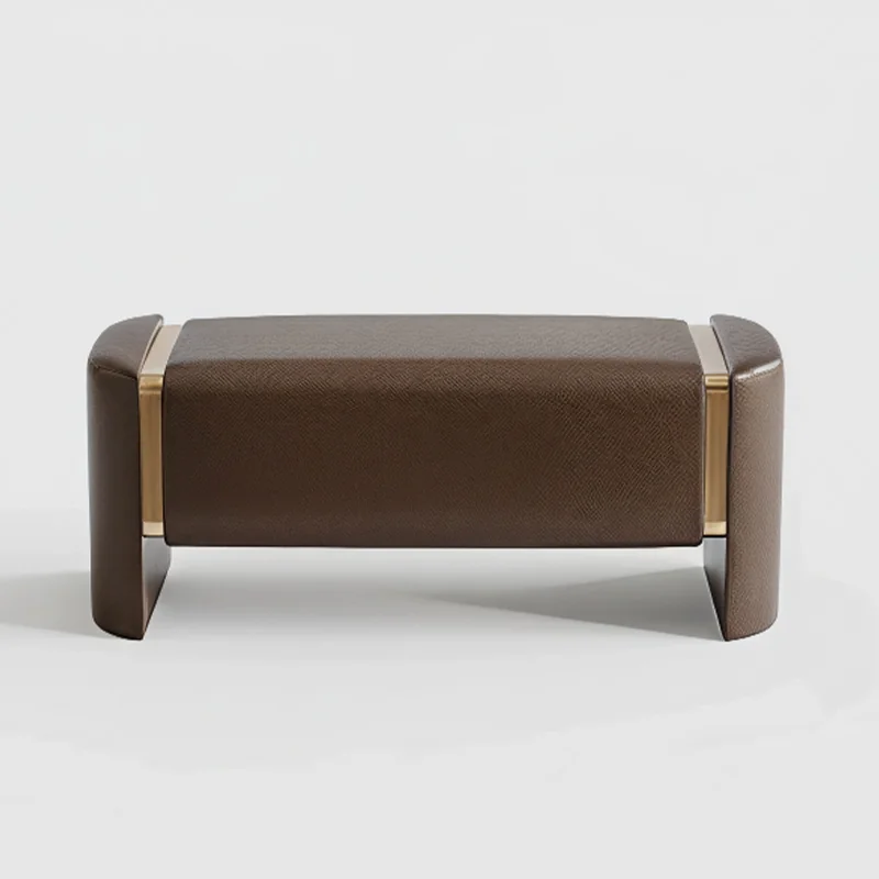 The Ingrid Ottoman adds a refined touch with its leather finish and golden details, designed as the perfect complement to the Ingrid Bed.