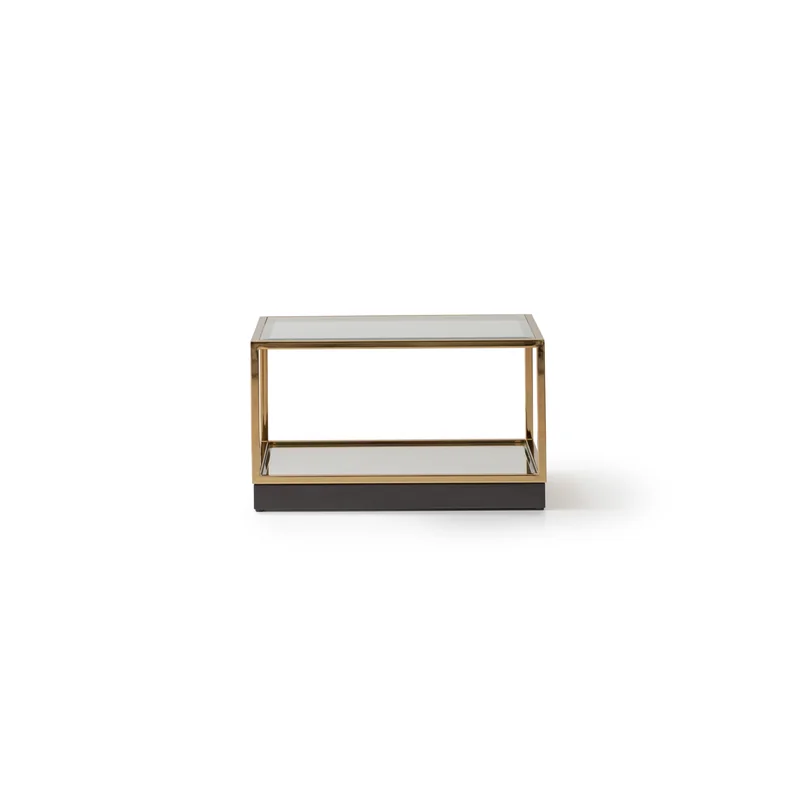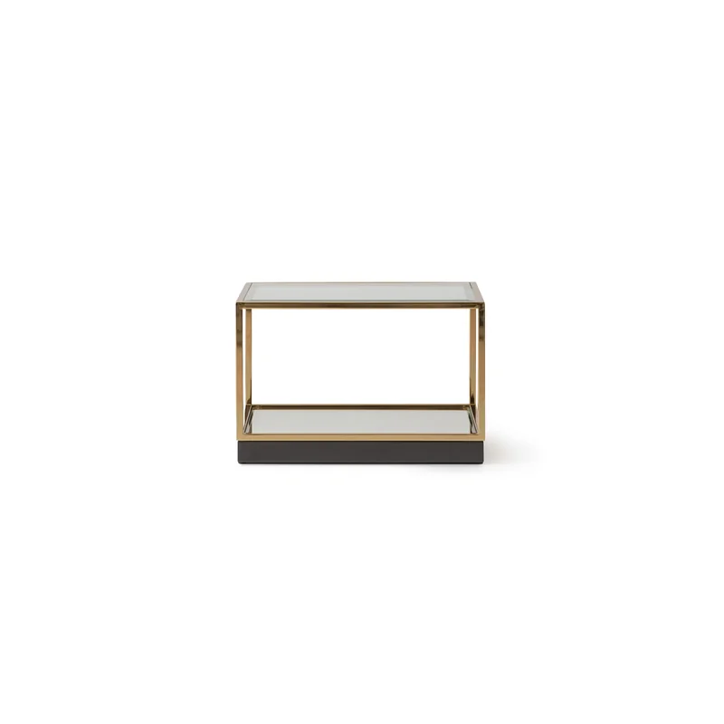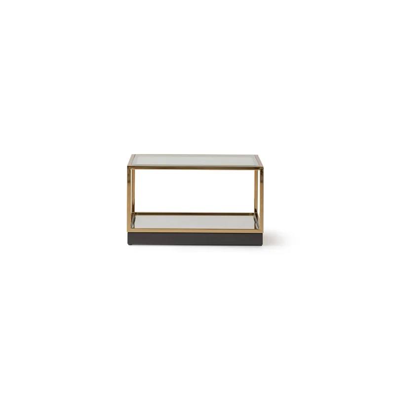 • Each cube is framed in polished golden metal, topped with clear glass, and grounded with a mirrored base that reflects light with striking brilliance.