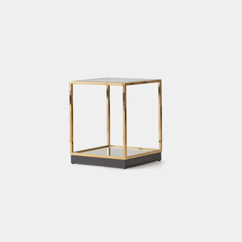 - The Norvyn Side Table is designed as a jewel-like accent, framed in polished golden metal with a modern cubic silhouette.
