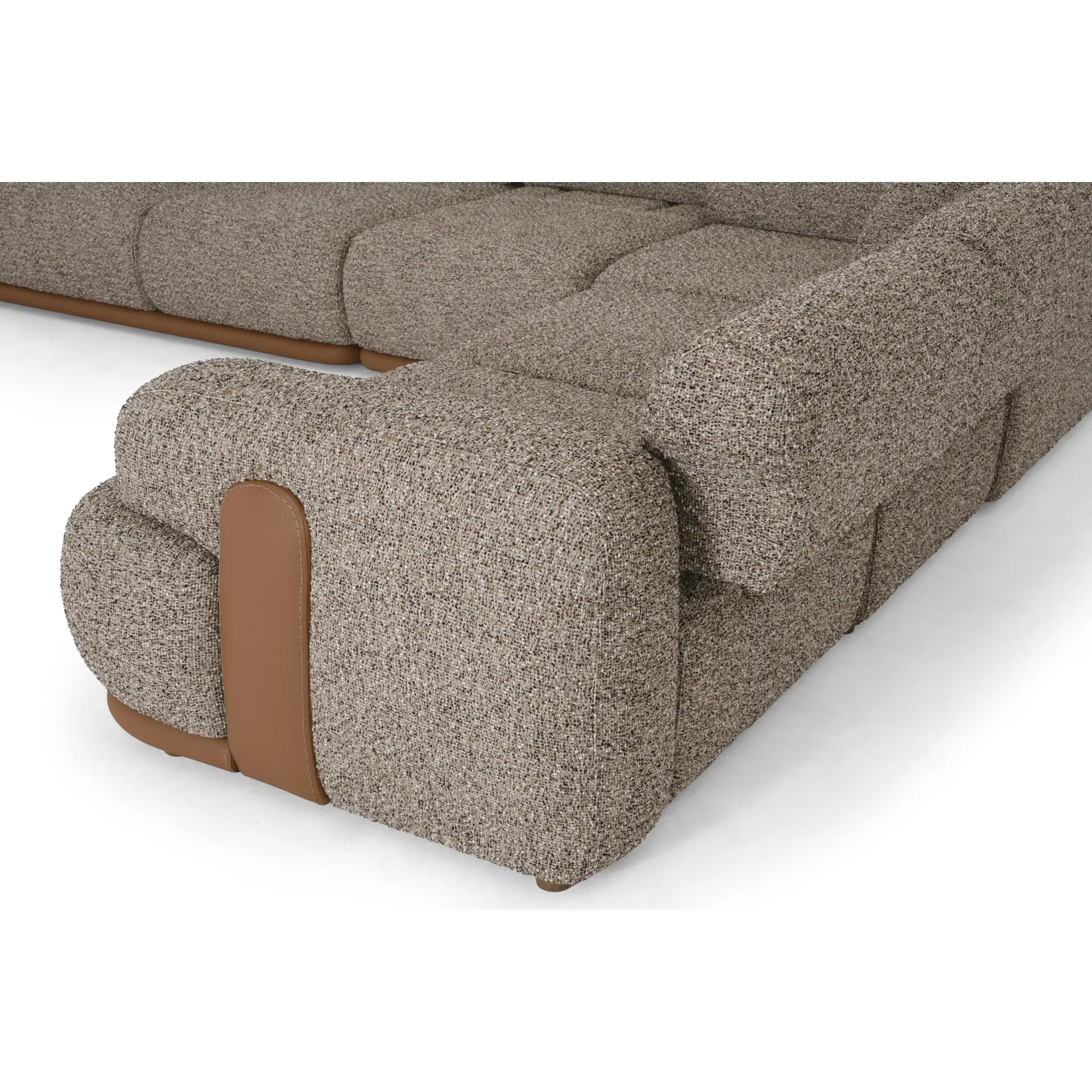 The Orson Modular Sectional is built for comfort. With a generous 105 cm (41.3 in) seat depth, it offers true lounge seating without feeling oversized. The structured modular design allows you to create different configurations depending on your layout. Upholstered in a textured woven fabric, the surface feels soft while maintaining durability for everyday use. Leather panels wrap around the outer arms and base, adding contrast and protecting high-contact areas.