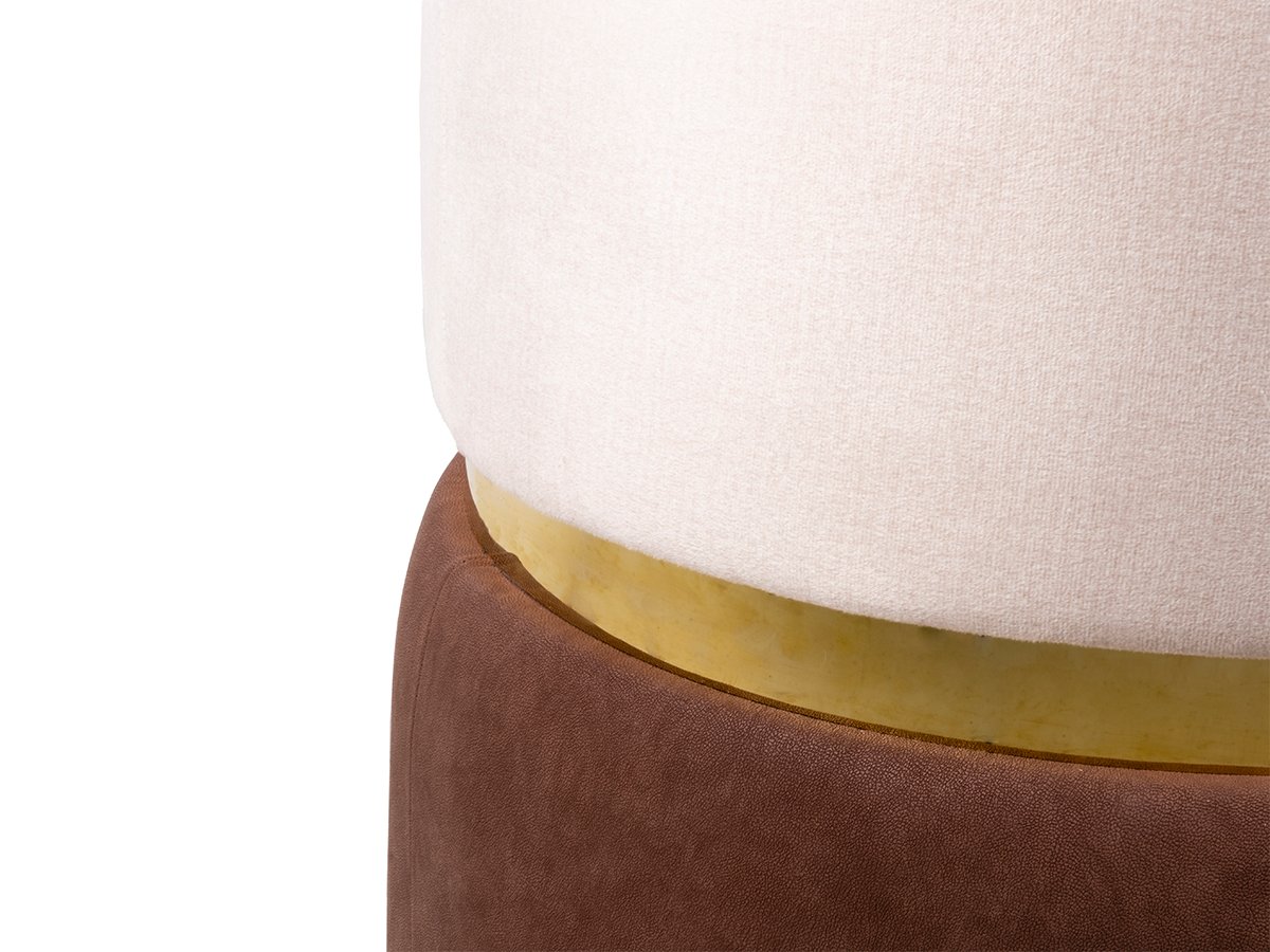 The Paola Ottoman is an exercise in balance. A smooth cream velvet seat rests gently above a rounded base wrapped in finely grained upholstery. Between them, a recessed satin gold band introduces quiet definition—never overpowering, always intentional. The cylindrical form feels grounded and architectural, while the seamless material transitions reflect thoughtful craftsmanship.