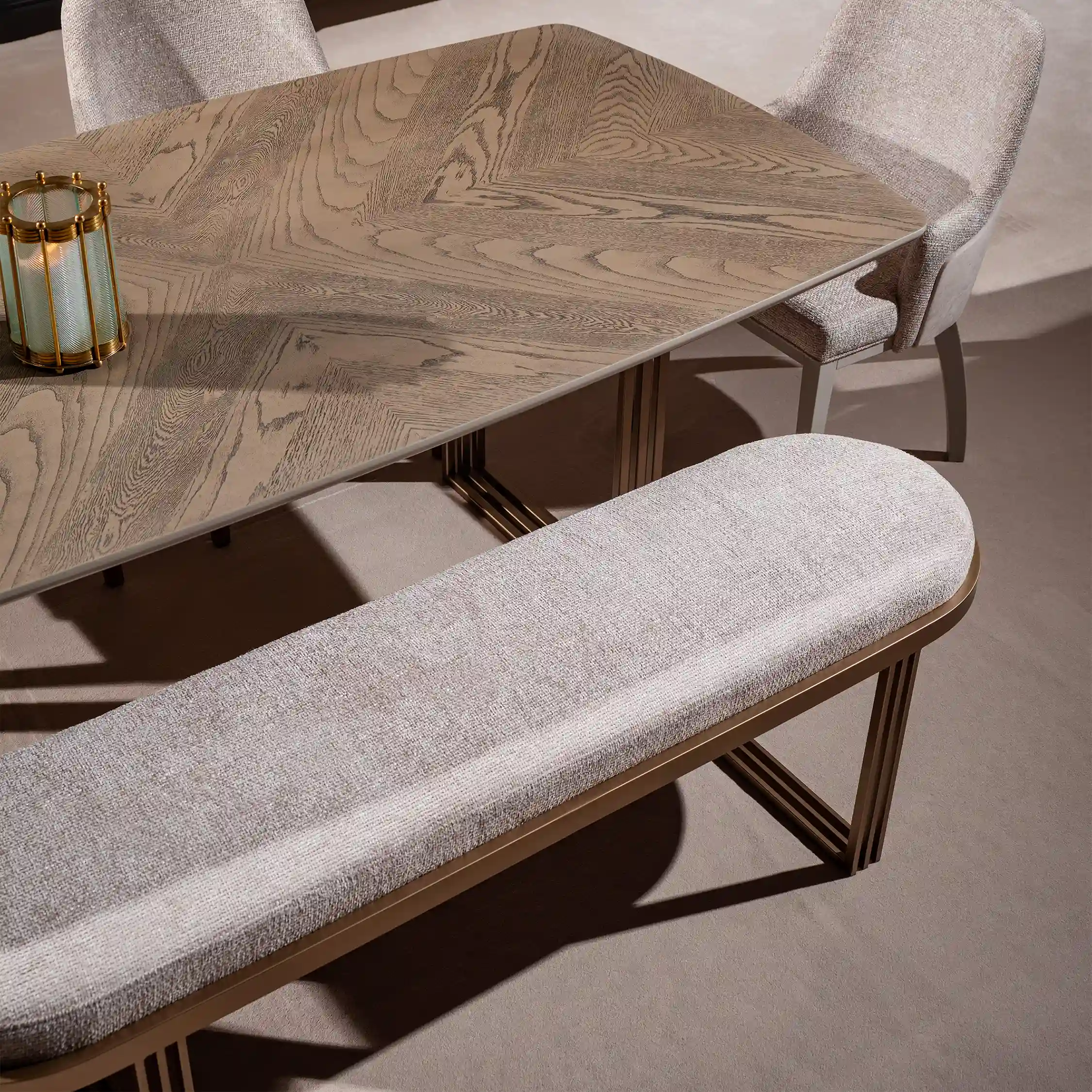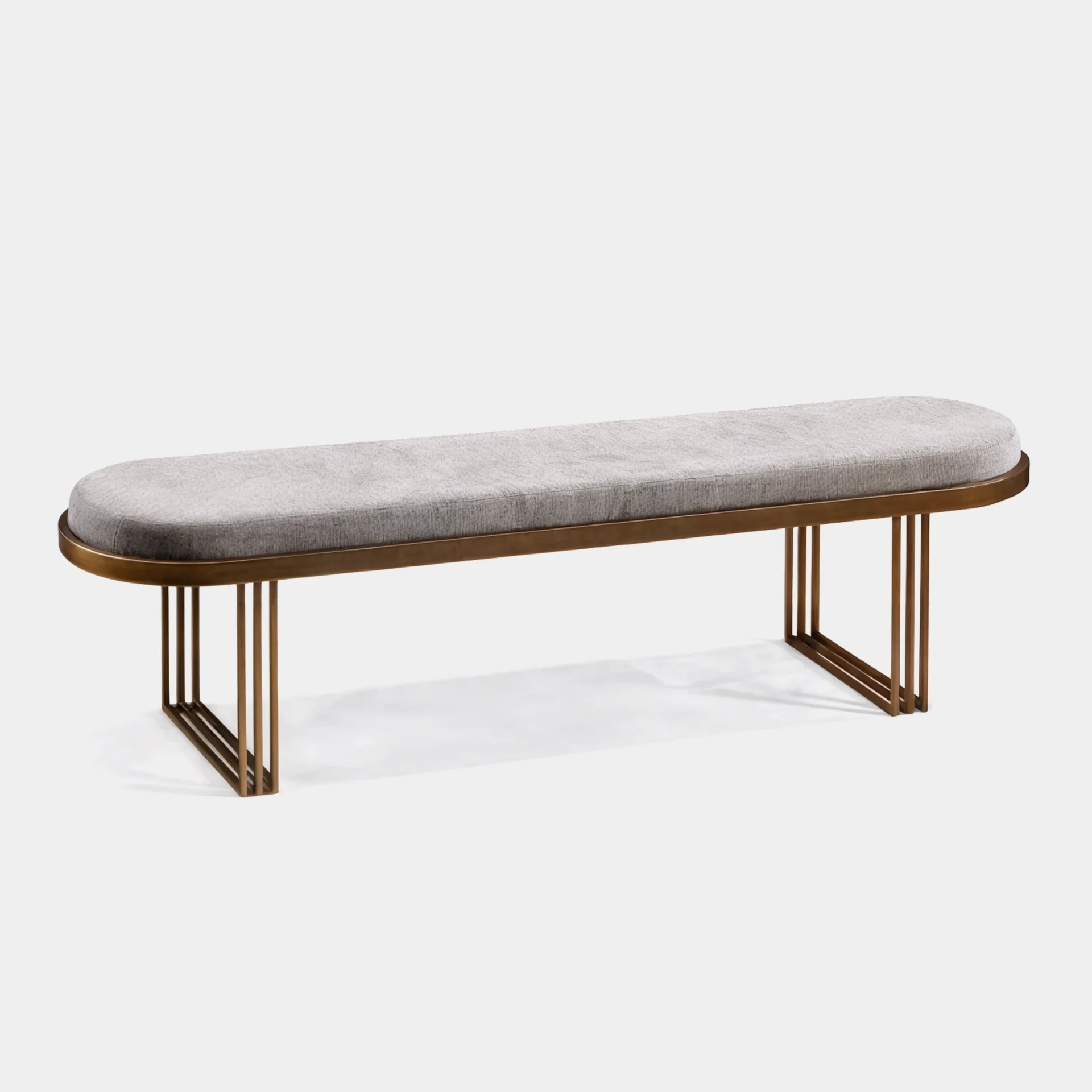 The Redwood Bench is a refined seating piece designed to complement dining tables, entryways, or bedroom settings. Its elongated form pairs a softly upholstered seat with an architectural metal base for a clean, balanced look.