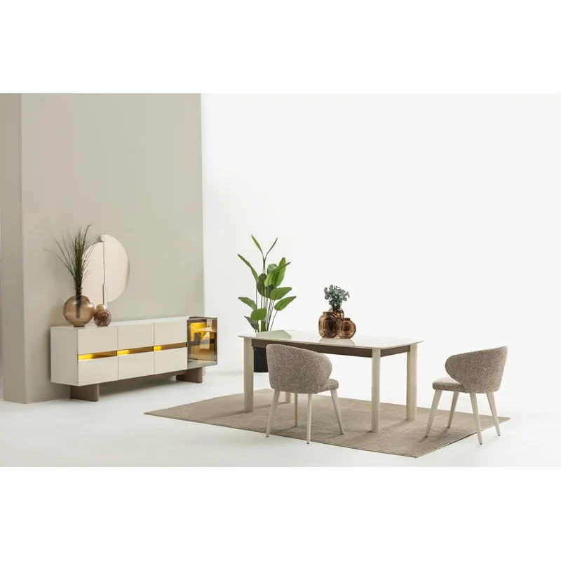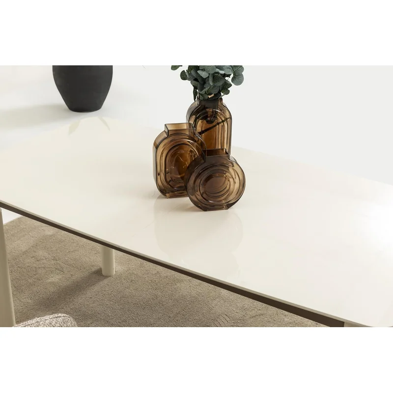- The Sierra Dining Table showcases a sleek glossy surface, radiating understated sophistication.