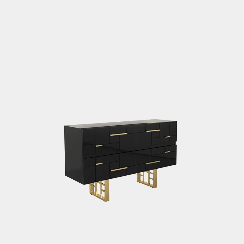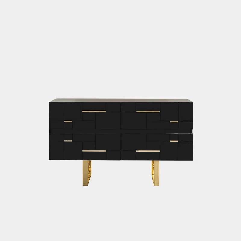 - Bold and modern dresser featuring a sleek black finish with gold accents for a touch of luxury.