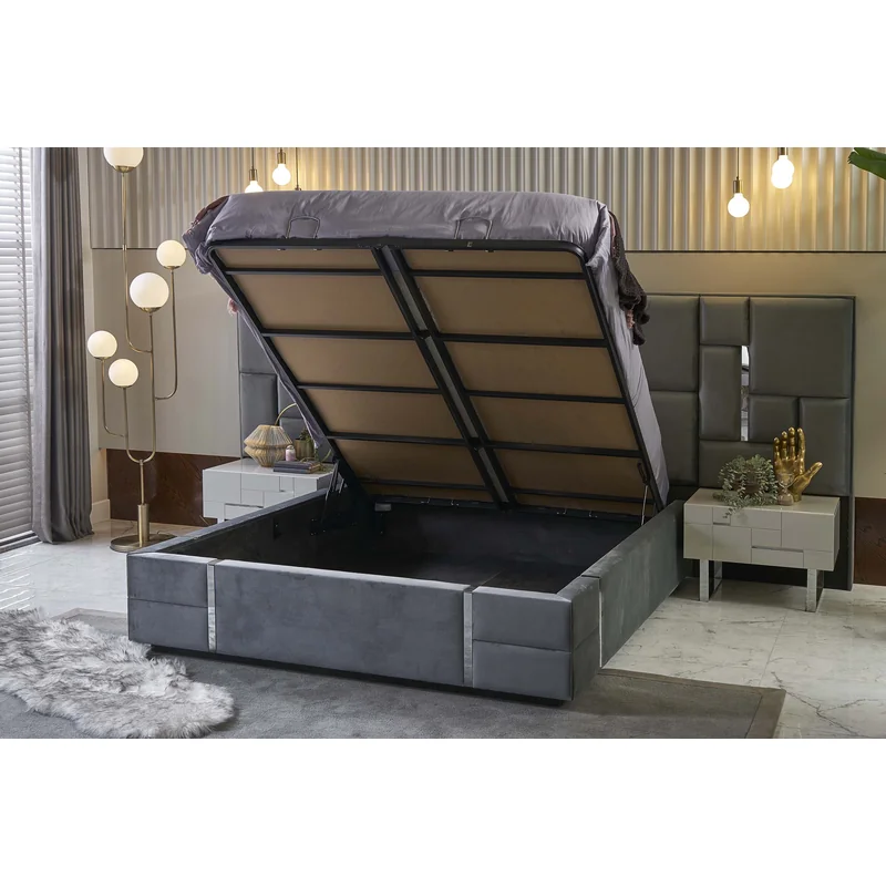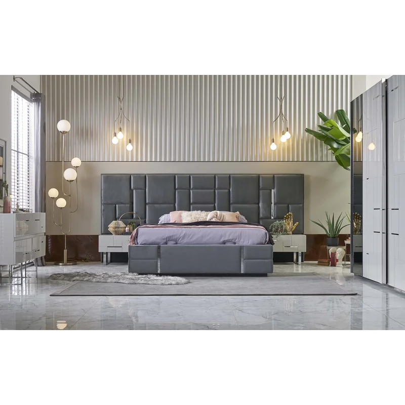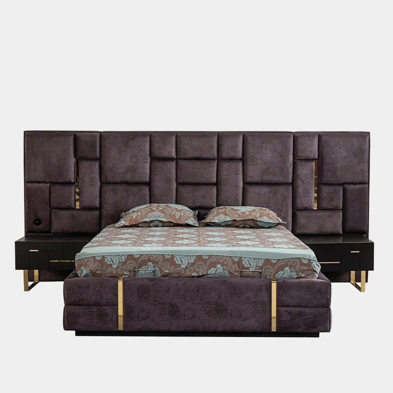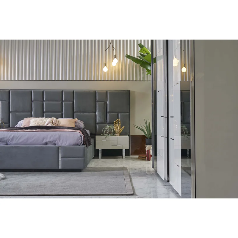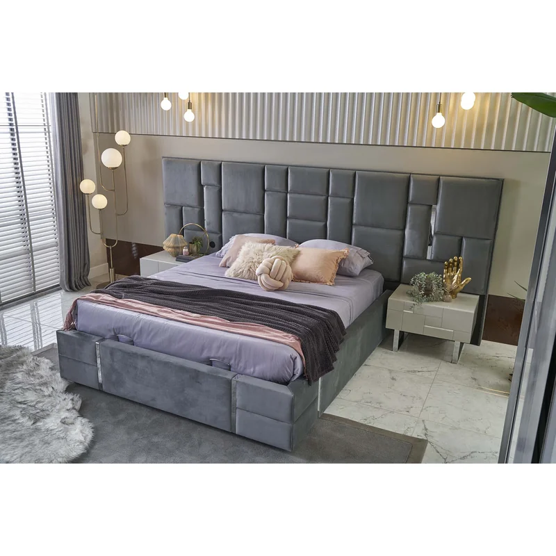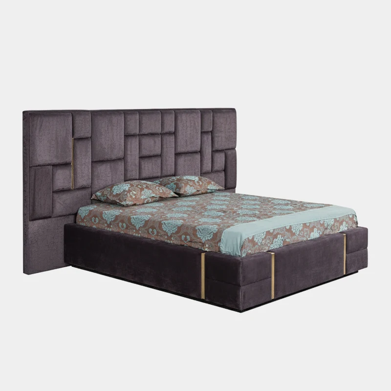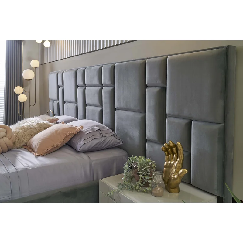 - Features a striking, geometric padded headboard that blends modern luxury with bold design.
