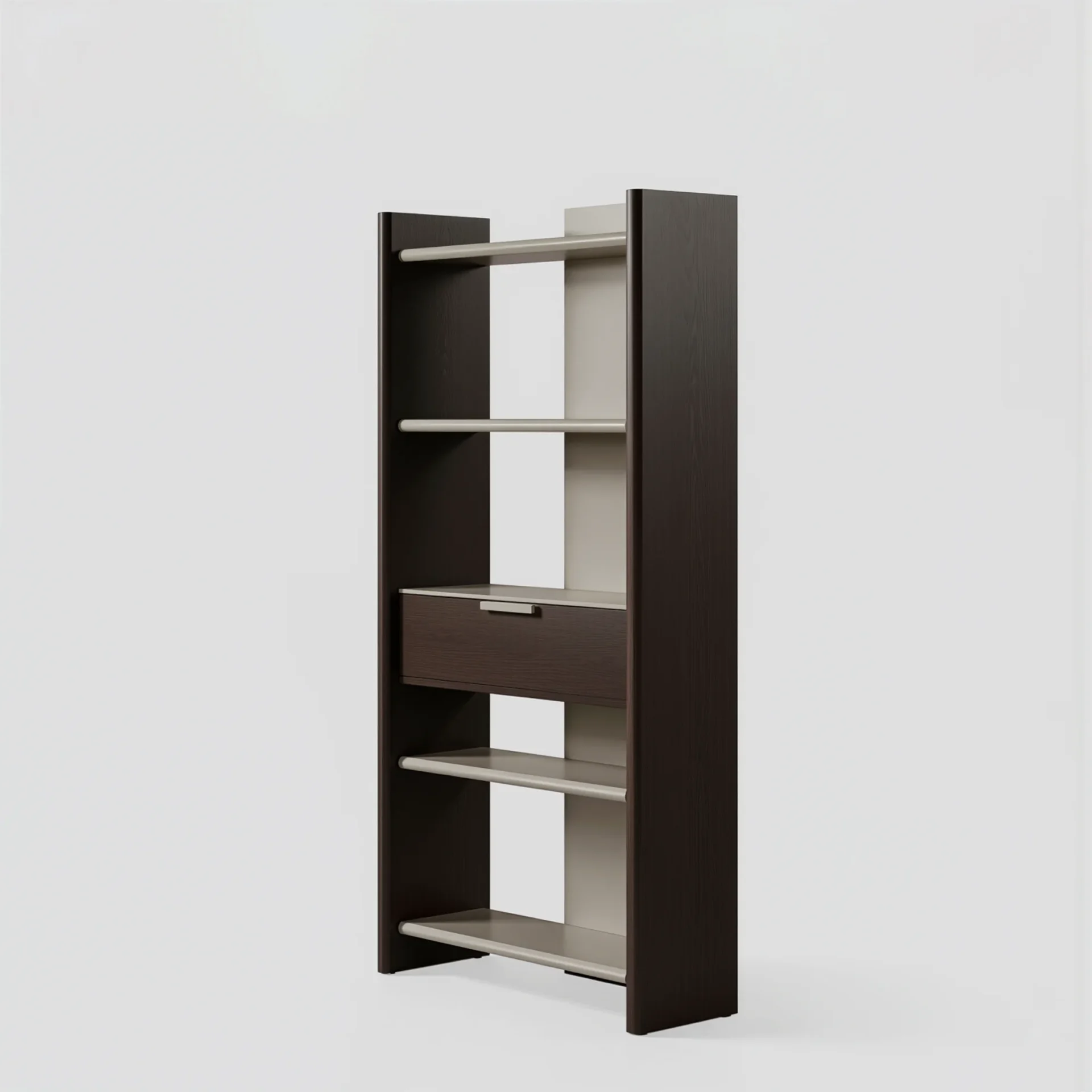 Designed with the same calm, structured approach as the rest of the Tarra Collection, this bookshelf features a slim vertical frame with open shelving and a contrasting central panel. The warm wood-tone side structure grounds the piece visually, while the lighter shelves create a sense of openness and balance.