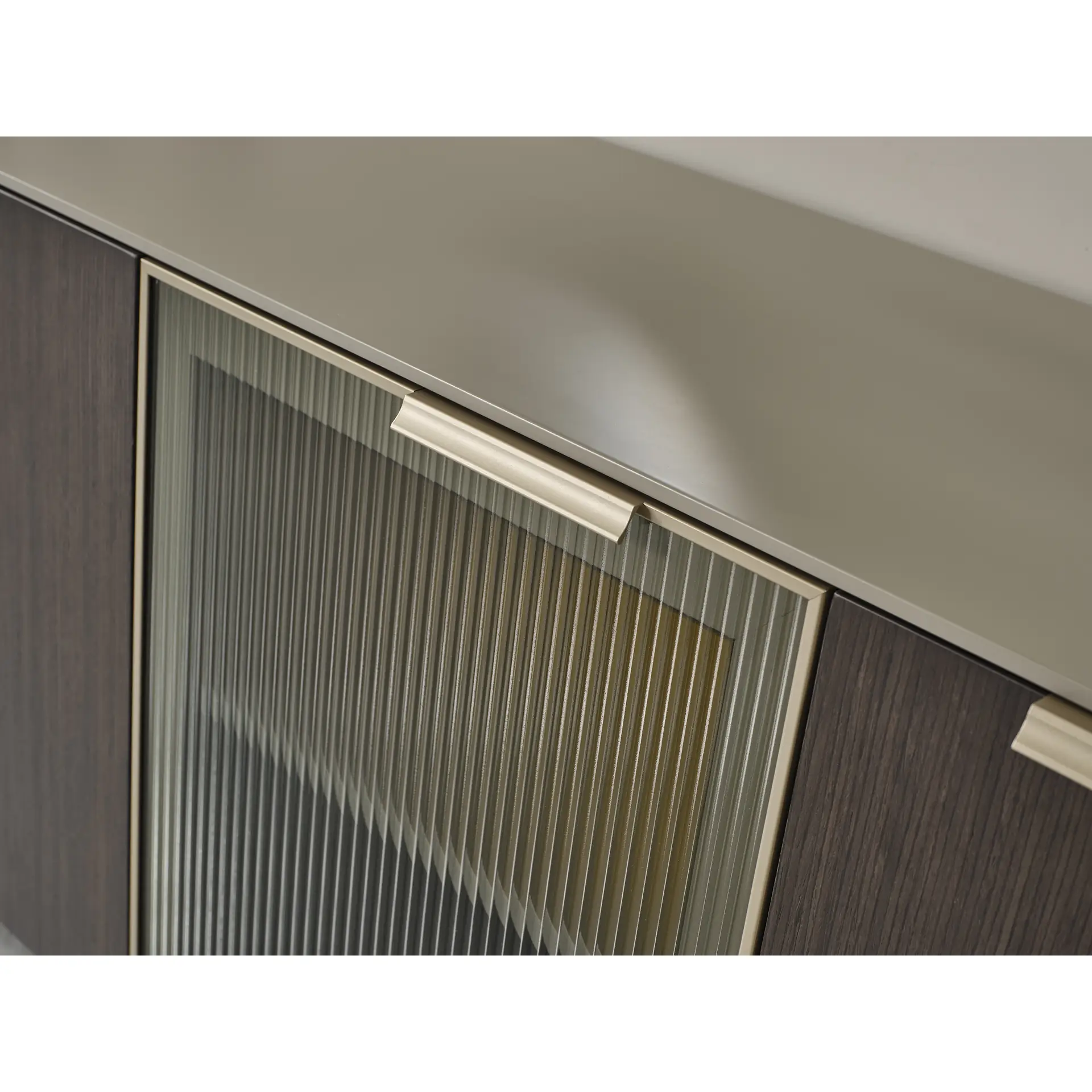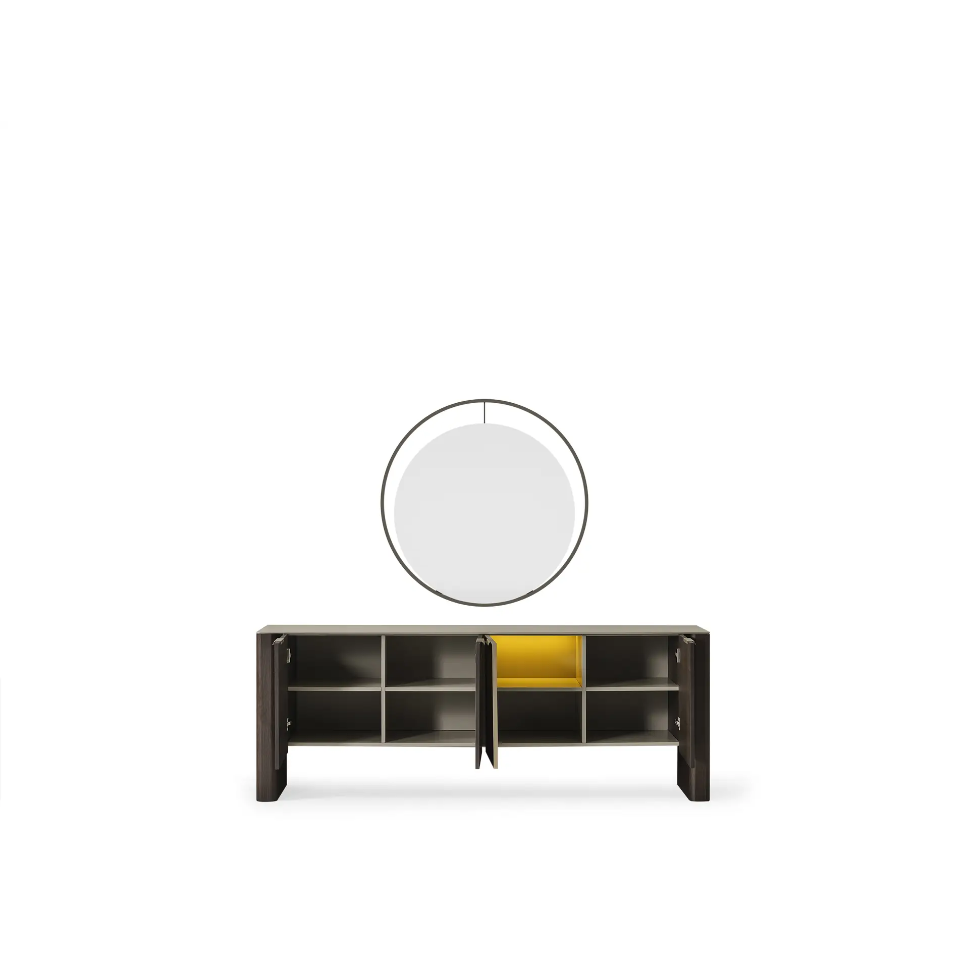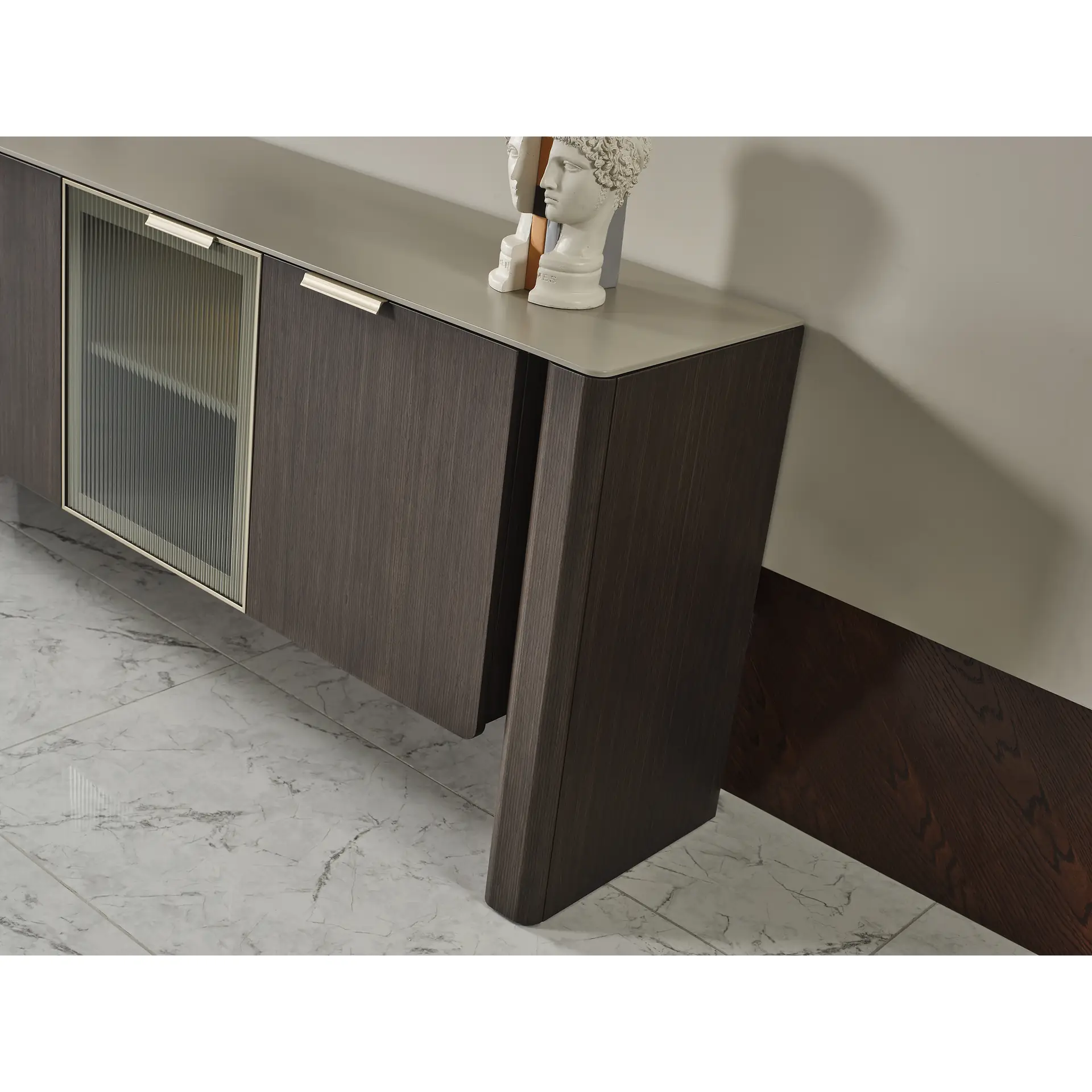 Behind its four-door front, Tarra reveals an organized interior with fixed shelving and a distinctive fluted glass door that introduces texture and visual depth. A single accent-colored interior compartment adds a quiet design highlight, creating a piece that feels intentional from every angle. Whether placed beneath a mirror, along a dining wall, or in a living space, the Tarra Console brings structure, warmth, and understated elegance to the room.