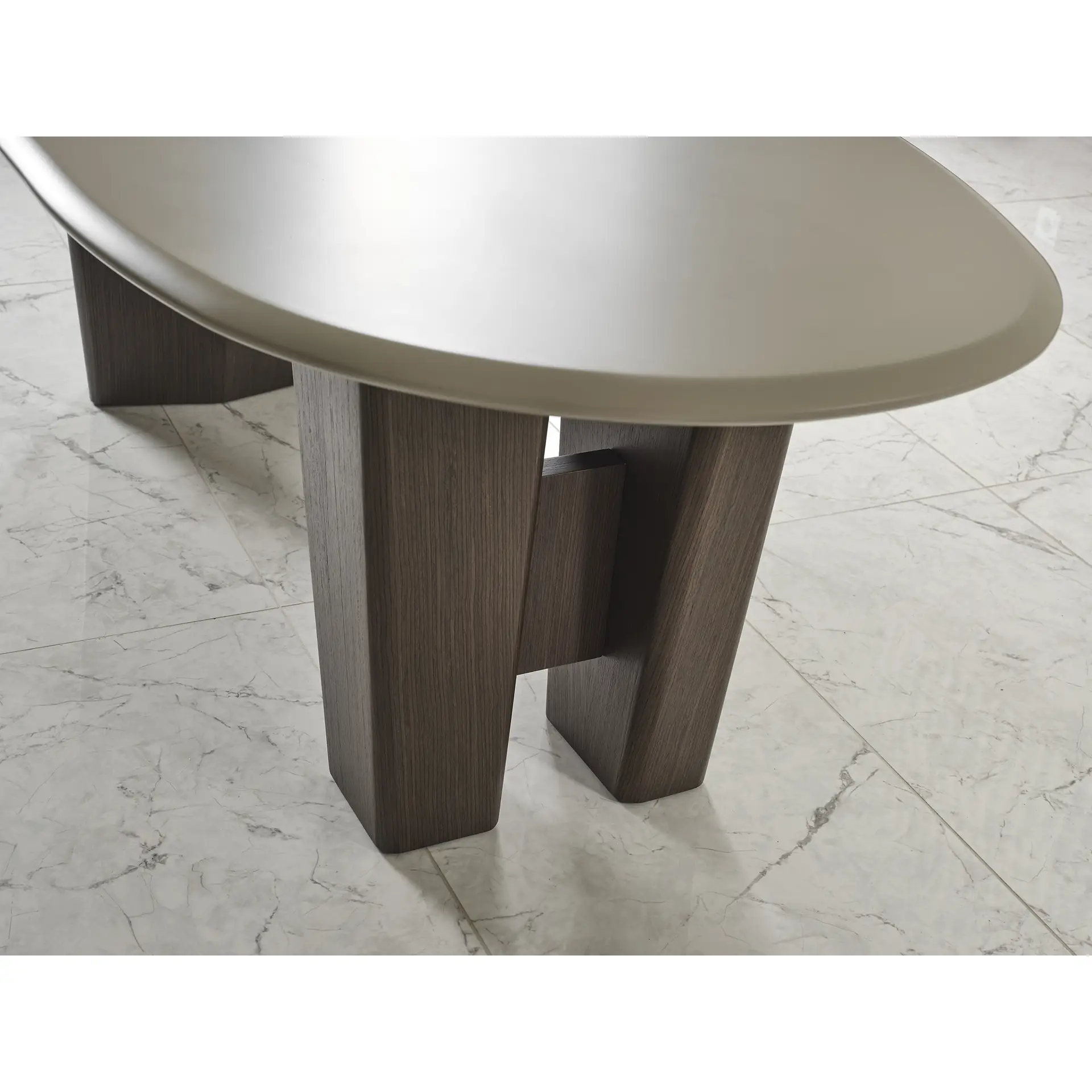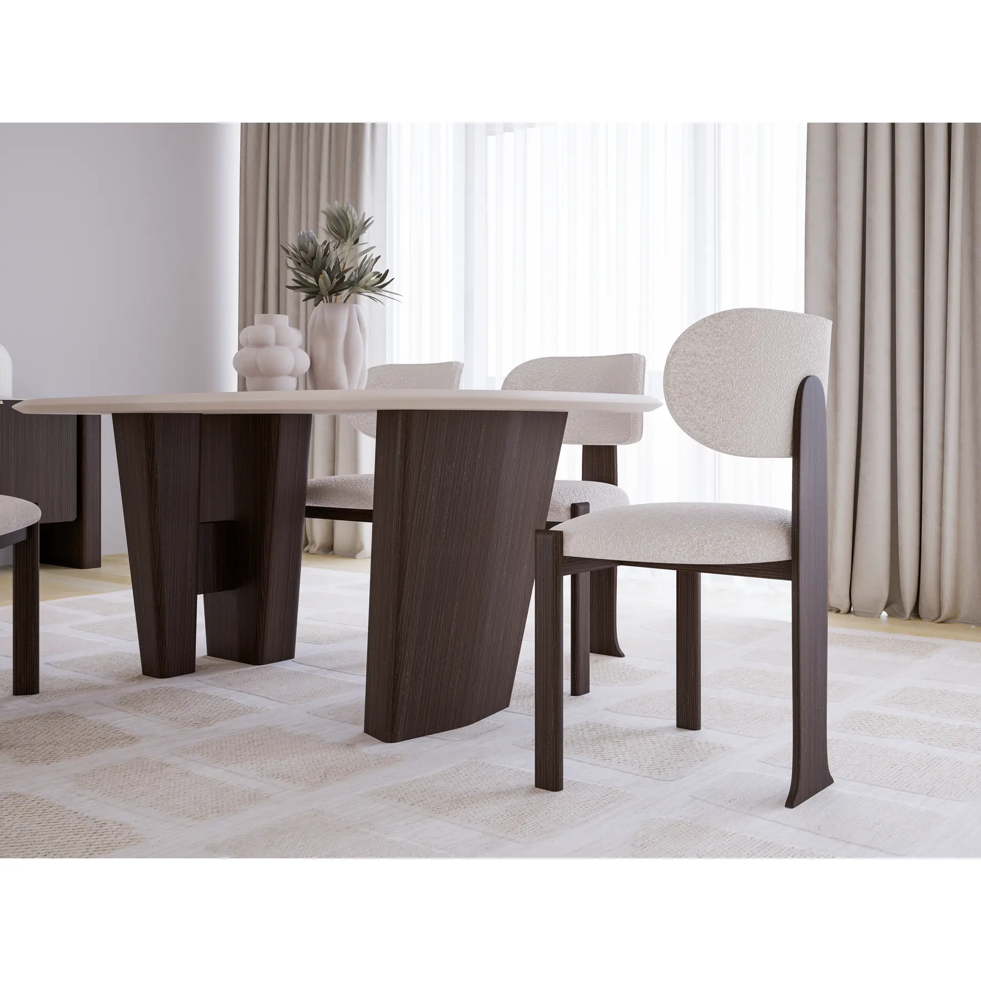 The Tarra Dining Table is shaped by contrast—smooth, flowing surfaces set against a grounded, solid base. The gently rounded tabletop introduces softness, while the angled wood legs create depth, stability, and a confident visual rhythm. Every detail feels intentional, balancing refined design with lasting presence.