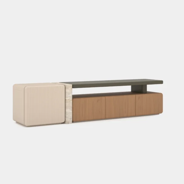 Anchoring the design, a natural stone base introduces weight and contrast, grounding the bookshelf visually while elevating it to a statement piece. A single integrated drawer provides discreet storage, allowing decorative objects and books to take center stage. Ideal for living rooms, dining areas, or open-plan interiors, the Tarra Stone Bookshelf balances artistry with everyday practicality.