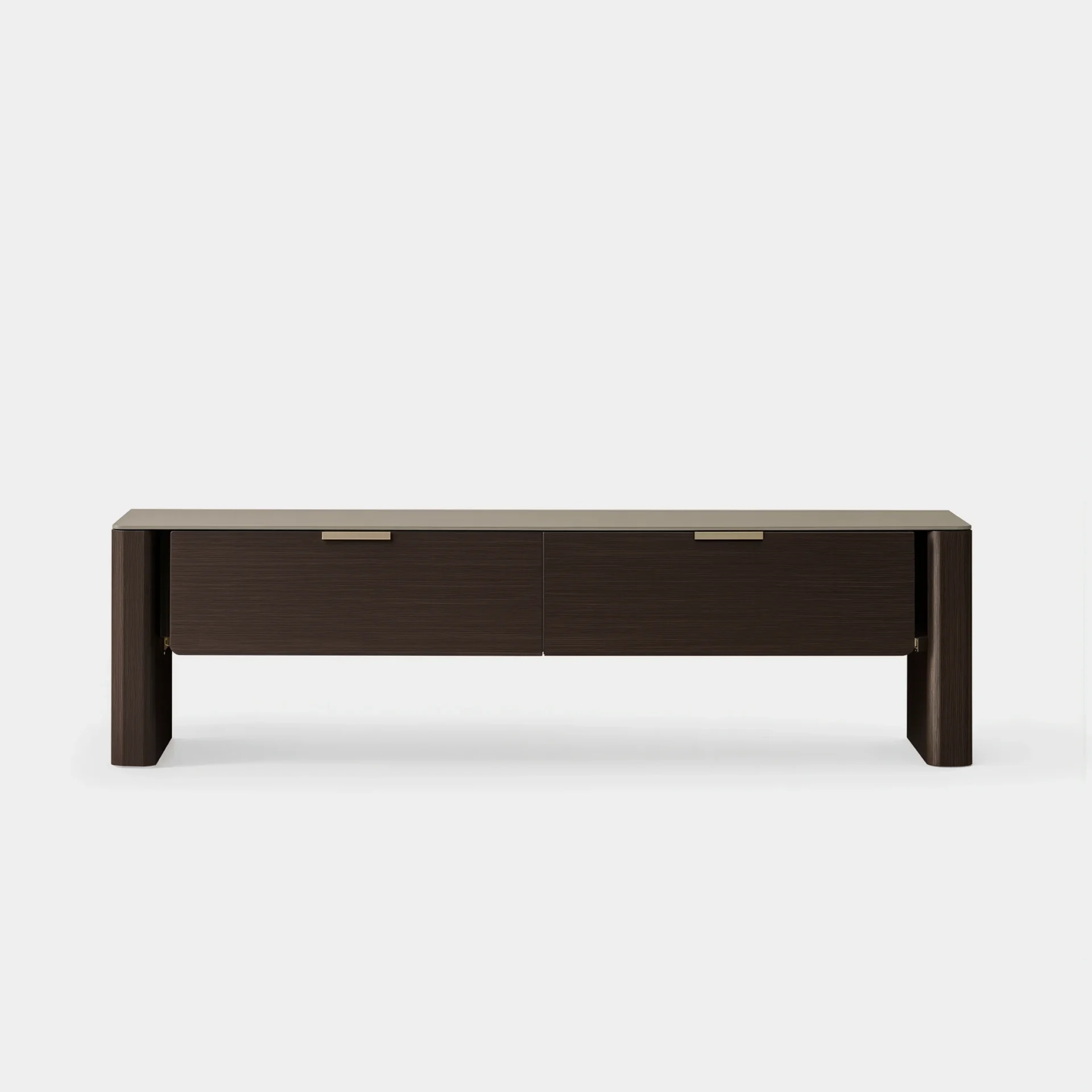 The Tarra TV Console reflects the collection’s refined design language through clean lines and thoughtful proportions. A dark wood-tone body provides visual weight and stability, while the light-toned matte top softens the silhouette with gently rounded corners. Minimal metal handles add a subtle accent without breaking the console’s calm, uninterrupted surface.