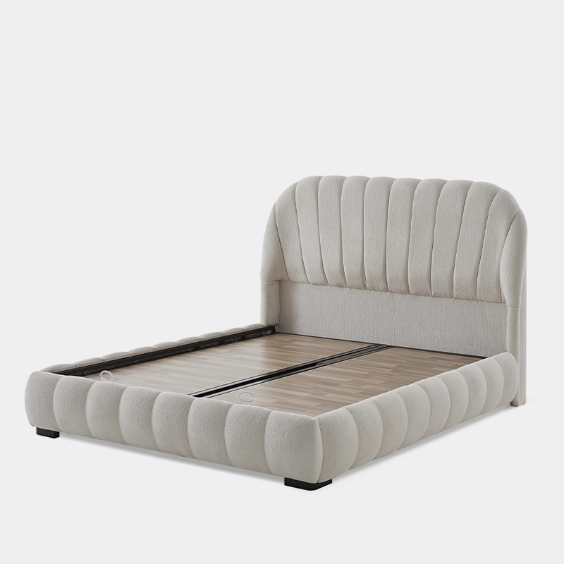 Tore — a softly sculpted upholstered bed with gentle curves and hidden storage, designed to bring quiet luxury and serene comfort into your bedroom.