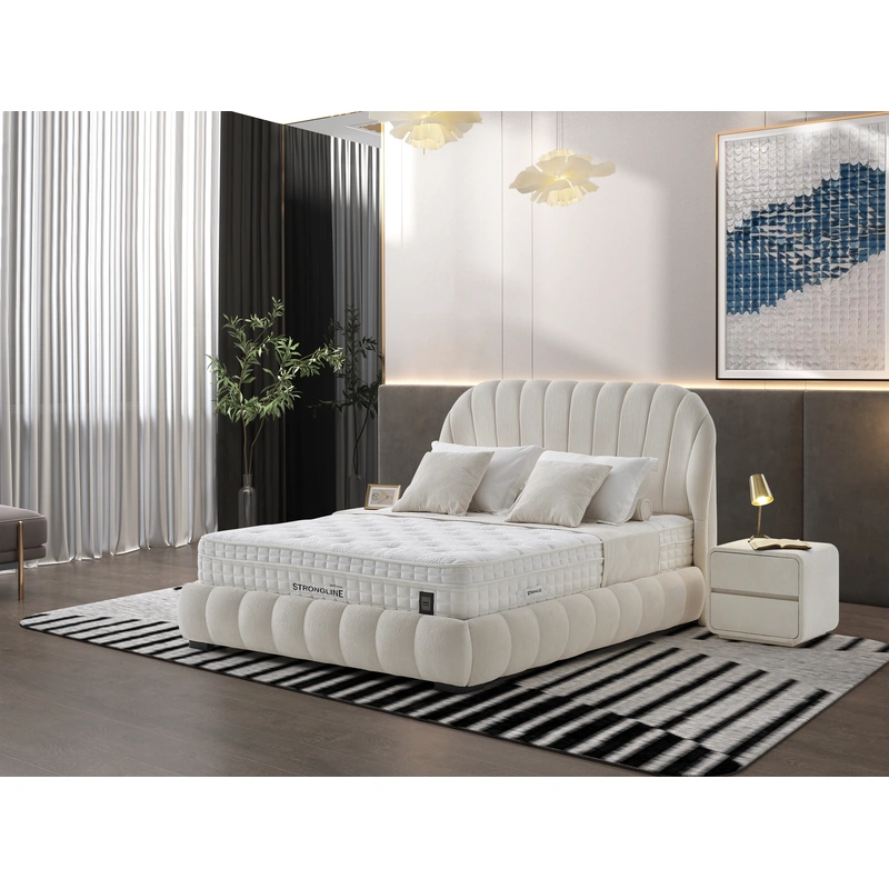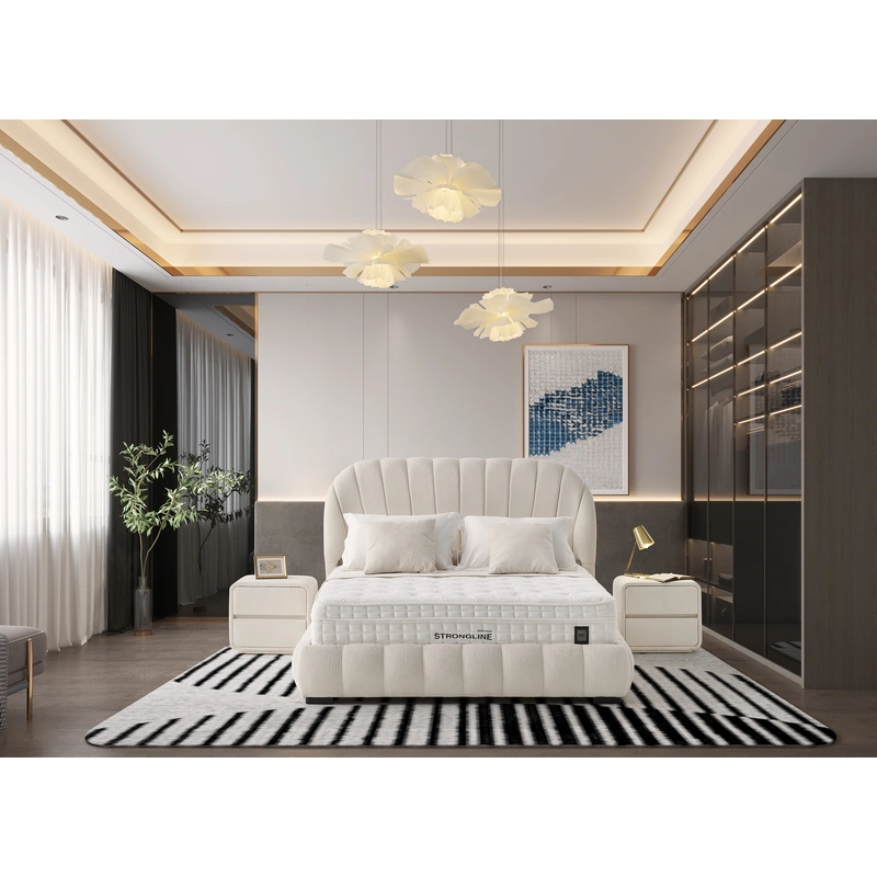 - Vertical channeled upholstery on the headboard adds depth and sculptural elegance, making the bed feel plush yet clean and contemporary.